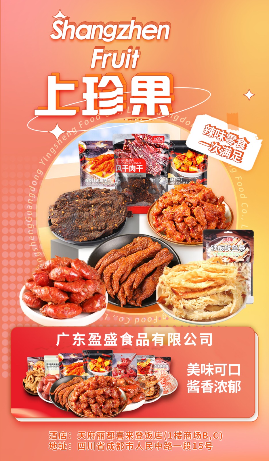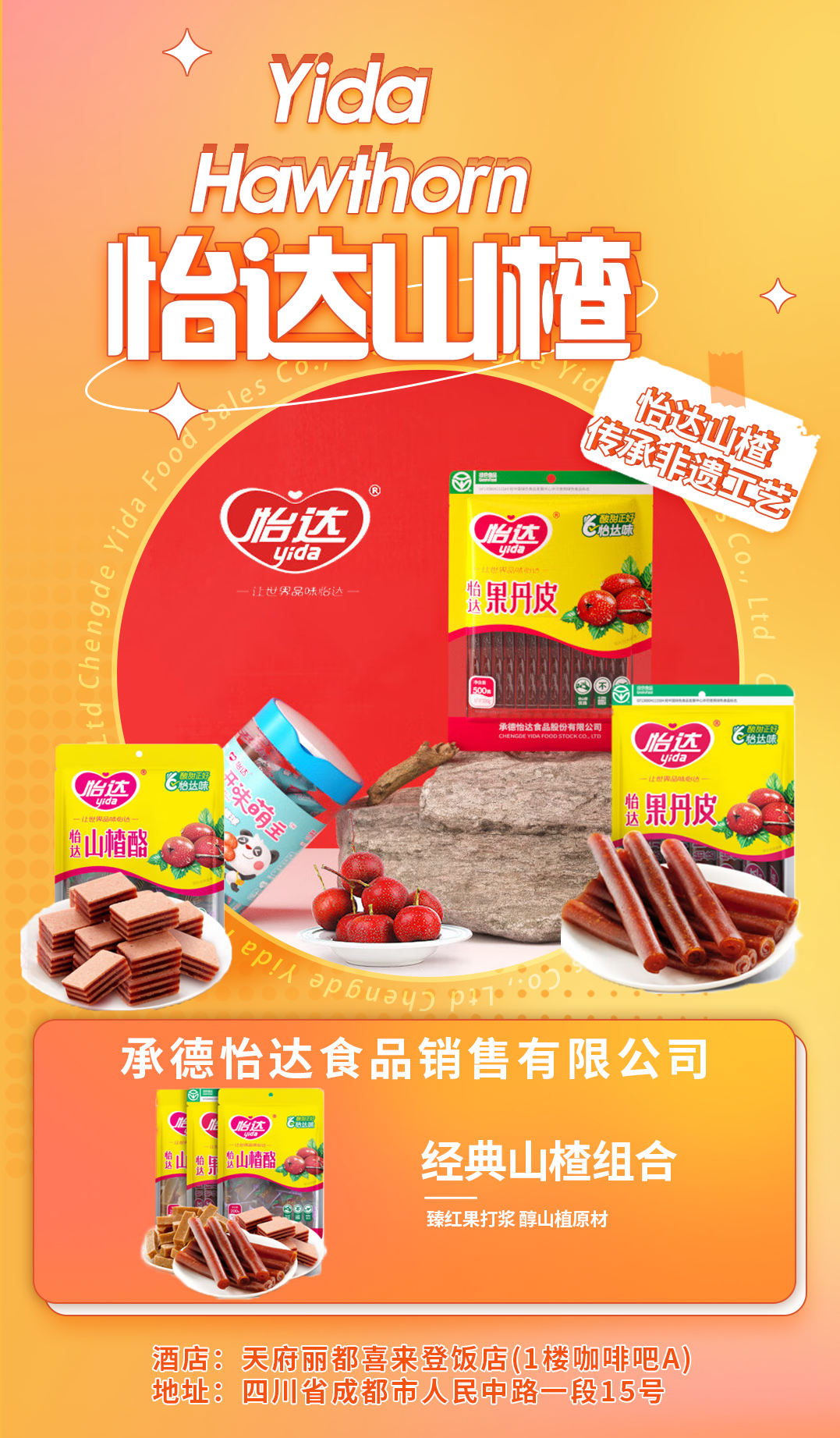 发表时间:2023-11-24 10:21 云食汇·休闲食品主题展区 天府丽都喜来登饭店 入驻品牌播报(二) 本次热点酒店——天府丽都喜来登饭店 位置优越,交通便利。天府丽都喜来登饭店地处“春糖之心”骡马市商圈C位,地铁1号线/4号线骡马市站D口,出站即达,位置绝佳。酒店拥有6000+㎡展厅,可容纳500+企业同时展出。 多渠道宣传,全方位推广。线下:酒店19楼以上为经销商住房;邀请湖南高桥大市场、临沂华丰市场、石家庄华北食品城、郑州百荣市场四大批发市场,亿级食品经销商集采,实现参展商与专业采购商精准对接。线上:会期定点投放抖音流量,同时在抖音直播云逛展推广,实现**程度的引流效果,为参展商带来更多的合作商机。 城市腹地、配套成熟。地处城市腹地,住宿出行,吃喝玩乐一应俱全,毗邻必打卡网红景点春熙路、太古里、天府广场、宽窄巷子、文殊院。 ![]() “天下山楂在承德,承德山楂在怡达”,公司位于**的山楂之乡——承德,是中国北方大型食品加工企业集团,是农业产业化国家重点龙头企业、国家林业重点龙头企业、山楂食品行业标准参与制定者。 怡达集团始建于1989年,传承李氏家族300年“果子单”秘制工艺,精选燕山山脉特有优质“铁山楂”为原料,以传统山楂食品为主线,不断创新、研发、融合。目前,已拥有传统怡达山楂、怡李济、灵猴部落、开味萌主、叽叽楂楂、轻轻相遇等6大品牌系列,近千种产品。产品销售市场覆盖全国10余万家大型商超卖场,出口多个国家和地区。历经34年,怡达集团已发展成为集种植、加工、研发、销售、文创、旅游、观光体验于一体,一二三产相融合的现代企业集团。
