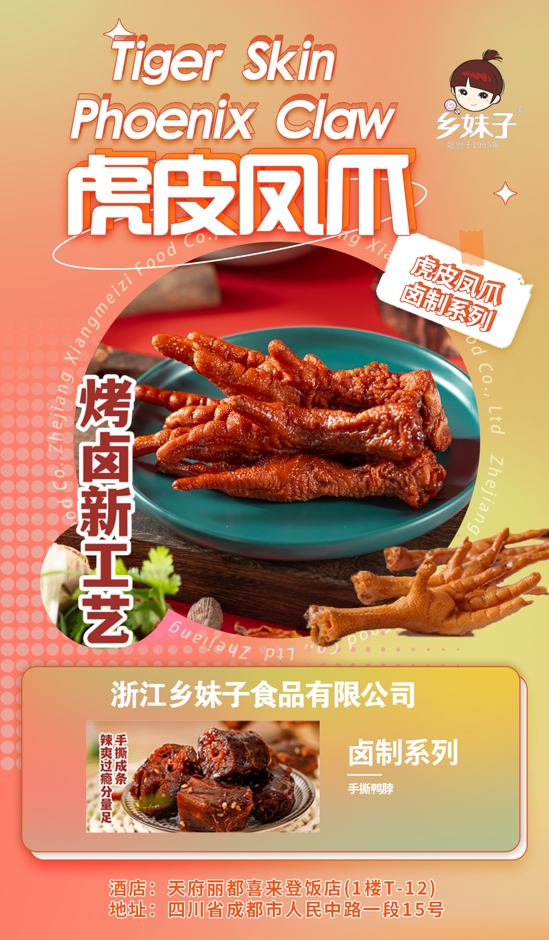 浙江乡妹子食品有限公司始创于1995年,是专业生产卤制系列食品的股份制企业,企业地处生产卤制食品闻名于全国的苍南县灵溪镇沪山工业园区,这里农产户密集,自然环境优美,是理想的食品加工基地。是集生产、经营、科研一体的温州市食品加工重点企业和农业龙头企业。公司专门从事肉、蛋类农产品深加工,每年可转化加工禽兽肉6200多吨,禽蛋5000吨,拥有先进的生产设备和标准检测仪器。内部管理规范,所生产的“乡妹子”牌鸡腿、鸡翅、鸡爪、猪蹄、五香蛋等卤制系列产品采用最新配方与现代化先进生产设备,结合百年传统工艺精制而成,它具有卫生、方便、美味可口,高蛋白,低脂肪,老少皆宜,无论是居家旅游、休闲、酬宾宴客、赠送亲友实为一种理想的食品,深得广大消费者的厚爱。