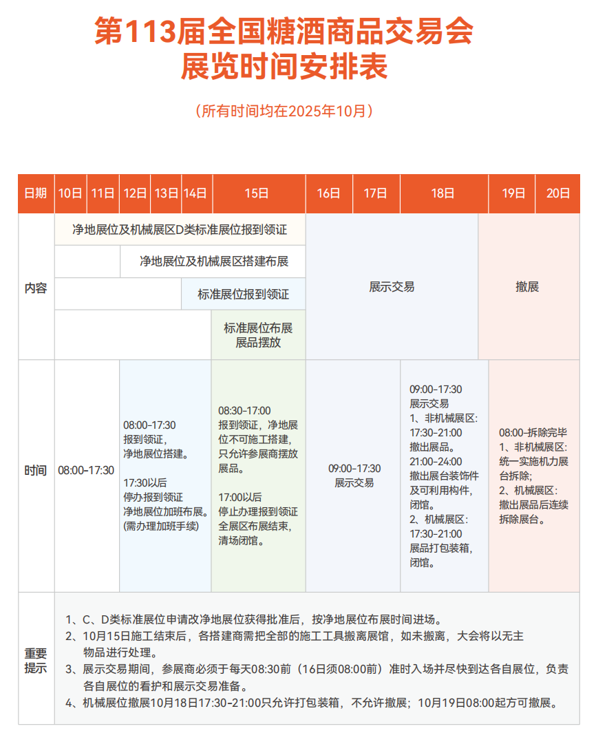 1-3. 展会概况 第113届全国糖酒商品交易会 时间:2025年10月16日-18日 地址:南京国际博览中心(江苏省南京市建邺区江东中路300号) 展会主题 一颗秋糖两头甜,今年最甜是南京 展览规模 本届全国糖酒会规划总体展览面积20万平方米,刷新全国糖酒会秋季会参展纪录,预计参展厂商总数将超3500家。 展区设置 调味品及配料、饮品及乳制品、潮饮及啤酒、国际葡萄酒及烈酒、传统酒类、国际食品、休闲食品、食品机械、包装及设计、江苏投资促进治谈区。 专区设置 绿色农业专区(百县千品万家福)、茶饮及咖啡专区、清香酒专区、酱酒专区、氵酒庄酒专区、中粮集团全家福专区、友好食品专区、食品科技成果专区、糖果及巧克力专区、健康食品及科技服务专区、方便速食专区、坚果及烘焙食品专区、国际机械专区、智能制造专区。 会议活动 城市活动